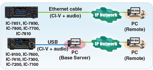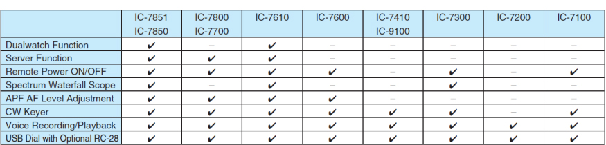 - Contrôle des fonctionnalités des radios ICOM depuis un PC en local (LAN) ou au travers d’Internet (WLAN) via le port USB, Wifi ou Ethernet